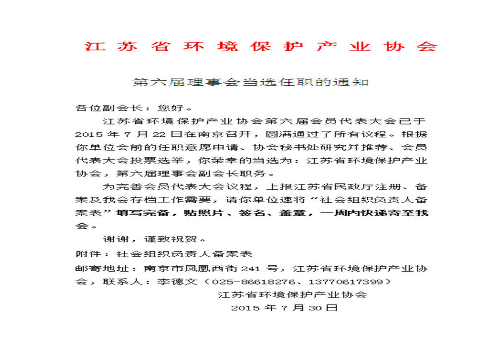 2015年7月22日,江蘇省環境保護產業協會第六屆會員代表大會在南京召開,根據我單位會前的任職意愿申請、協會秘書處研究并推薦、會員代表大會投票選舉,我單位榮幸的當選為:江蘇省環境保護產業協會,第六屆理事會副會長職務。