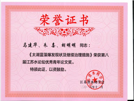 恭賀馬建華、朱喜、胡明明同志編寫的《太湖藍藻爆發出狀及繼續治理措施》榮獲第八屆江蘇水論壇優秀青年論文獎。